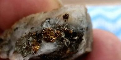 Gold, copper, and silver mineralization associated with quartz veining is present in a number of areas in the license areas having previously been trenched and in one location mined (illegally).
